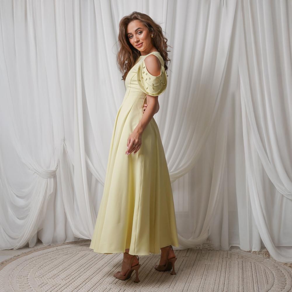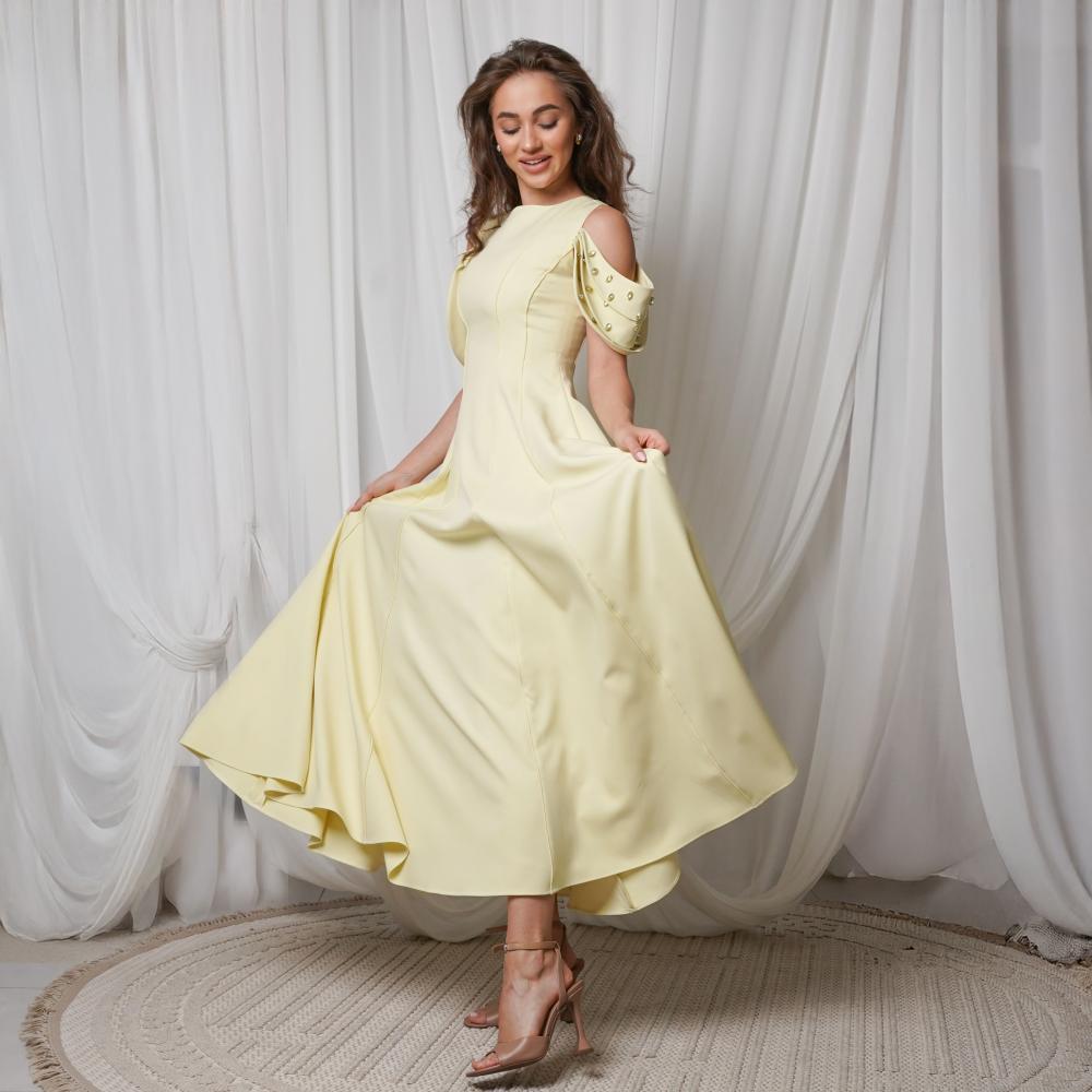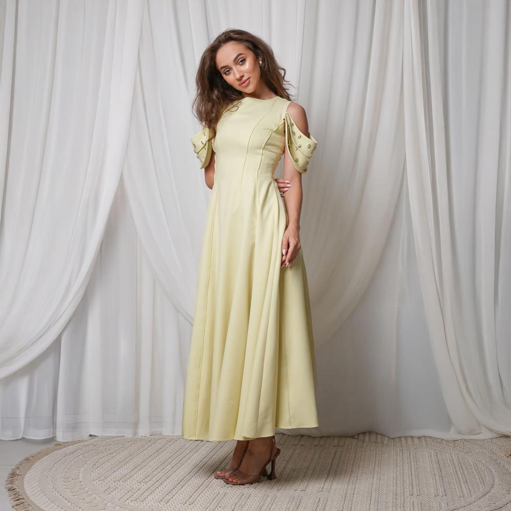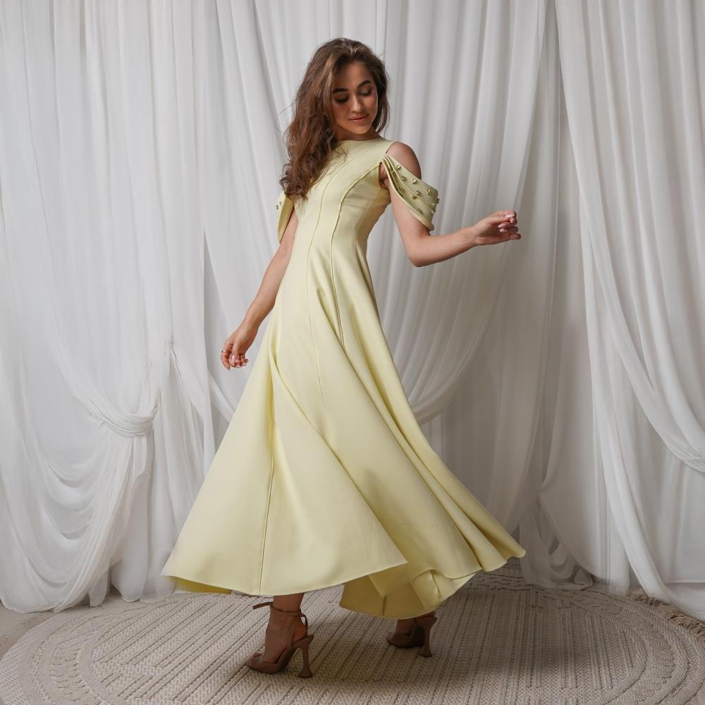 تميزي بإطلالة راقية مع هذا الفستان المصمم بعناية من قماش الكريب الفاخر الذي يمنحك نعومة وانسيابية مثالية. يتميز الفستان بقصة انسيابية أنثوية وأكمام مفتوحة مزينة بكريستال سواروفسكي الأصلي، تضيف لمسة فاخرة من البريق والتألق. التصميم يناسب المناسبات الخاصة والسهرات، ويجمع بين الأناقة والبساطة في آنٍ واحد.